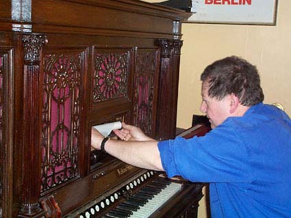Bernie Brown loads a music roll into the Orchestrelle