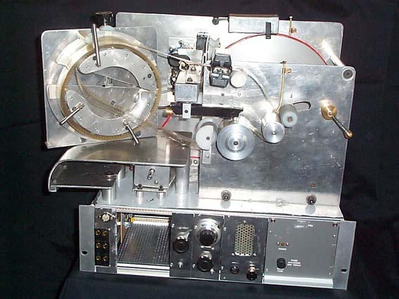 The main drive motor is partly visible underneath the magazine platform. It drives the 10" [254mm] diameter flywheel by means of a red-coloured polyurethane belt. A magnetic tachometer pickup, mounted above the flywheel, detects a pattern of magnetic ink bars printed on an acetate strip which is attached to the flywheel rim. The flywheel speed is compared with the setting of a 10-turn calibrated potentiometer and a correction signal derived, this is used to control the motor speed. The flywheel drives the capstan by means of a shaft which is supported by a pair of silent-running sleeve bearings in self-aligning resilient mountings with internal lubrication reservoirs. Lubricating oil is introduced to the main bearings through supply pipes from remote oil cups, so as to reduce the possibility of oil spillage finding its way onto components which come into contact with the film. The rubber-sleeved nylon pressure rollers run freely on polished silver-steel stub shafts and do not require additional lubrication. The replay anvil/braking capstan is mounted on the shaft of a four-pole skewed-rotor A.C. induction motor with a single silent-running sleeve bearing. When fed with D.C., this provides smooth braking torque which is made adjustable by means of a control knob adjacent to the speed control. The magazine comprises a circle of free-running nylon rollers which support the film loop, one roller at the draw-off point being of larger diameter than the others to reduce bending stresses where the film is pulled from the magazine. The body of the magazine is split, with the upper portion fixed and the lower portion swinging on a pivot so as to permit easier loading and to accommodate film loops which may have attained a non-standard length through shrinkage. An adjustment screw allows a controlable amount of slack to be maintained when running delicate films. The whole magazine can be easily detached by means of a knurled nut (not visible) to simplify loading and unloading and to reduce the risk of snagging the film and damaging it. The magazine platform is curved to allow non-standard film loops to be suspended freely, if they will not fit the magazine, and fed into the mechanism from below. The lever towards the top RHS allows the pressure rollers to be disengaged and swung clear during loading. A velvet-sleeved finger (top) wipes dirt from the surface