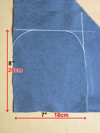 Chalk a mark across this line about 3" 8cm below the waistband edge of the panel to indicate the position of the top edge of the pocket. |