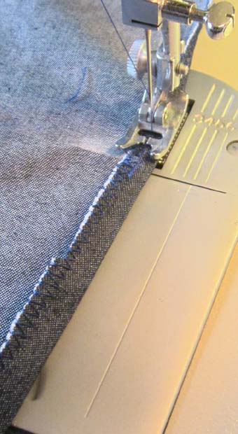 Put the material in the sewing machine Wrong side up, and locate the back centre mark. Sew the raw edge all around the hem with a zig-zag stitch, beginning a short distance before the centre marker and ending a short distance after it. |