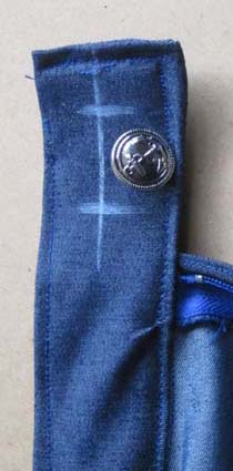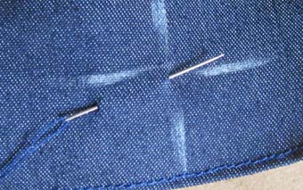 Mark out a centre line on the waistband flap and add two cross lines spaced by about the diameter of the button plus half as much again. This will give the correct size for the button hole. |