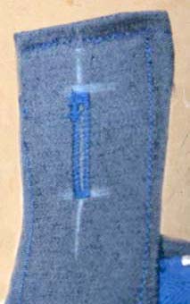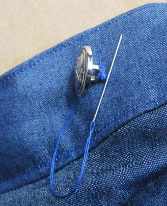 Mark out the centre line and ends of the button hole on the waistband flap using tailor's chalk, then lay down a pattern of zig-zag stitches . Cut a slot for the button along the centre line, the pattern of stitching will prevent the edges of the hole from fraying.