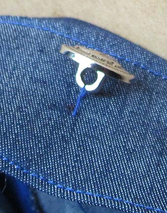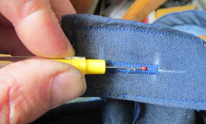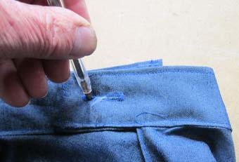 Push a sewing needle through the belt material from the button mark on the outside. Mark the inside to show where the button will be. |
