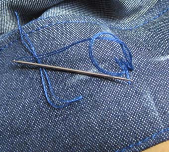 Push the needle crossways through the 'tail' at least twice, then push it through to the inside. |