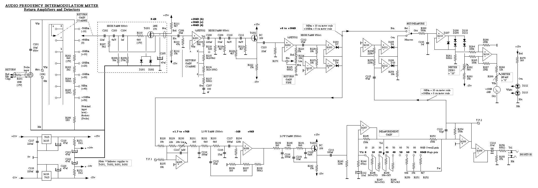 The return signal is attenuated to a standard level and filtered to remove the low frequency signal, the remaining high frequency signal is rectified. If any intermodulation has occurred, the amplitude of the high frequency signal will have ripple at the low frequency superimposed on it. This low frequency ripple is passed through a filter which removes any residual high frequency, further amplified by an accurately known amount, and detected. The ratio of the ripple to the high frequency signal is a measure of the intermodulation which has occurred.
