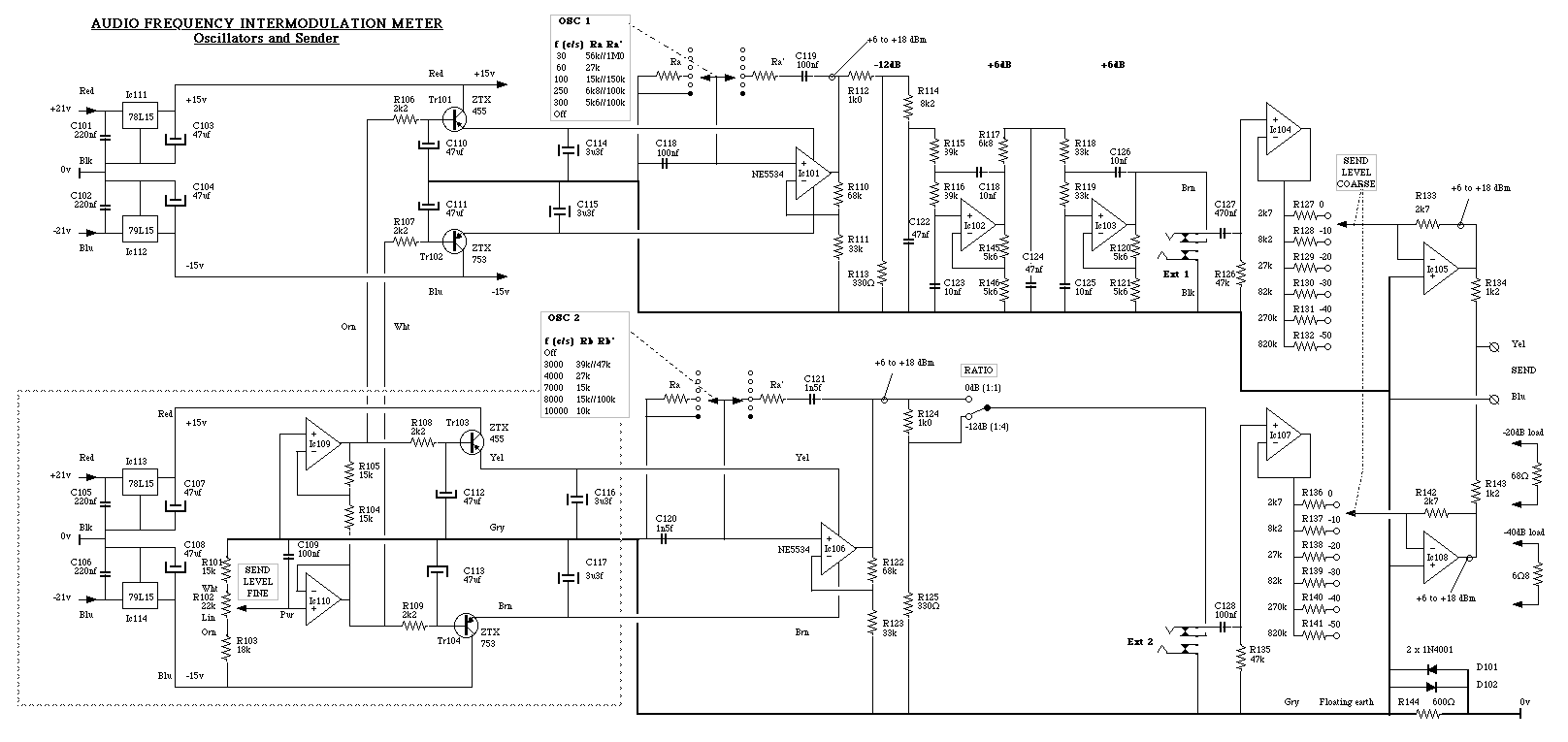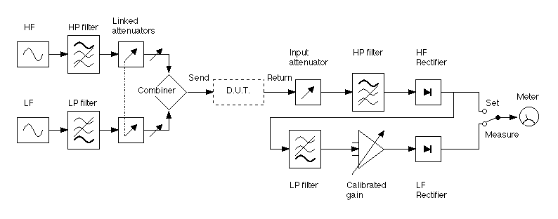 In normal operation, the combined signal is set to a suitable level for the device under test. The level of the returning signal is measured with the meter in the SET position and the input attenuator is adjusted in coarse and fine steps until the meter indicates a reference level. The meter is then switched to MEASURE and the gain of the low frequency ripple amplifier adjusted in steps until the meter reading is on scale. The meter reading is added to the accurately-calibrated amplifier gain step to get the level of intermodulation in units of dB.