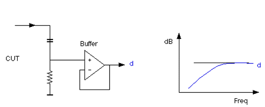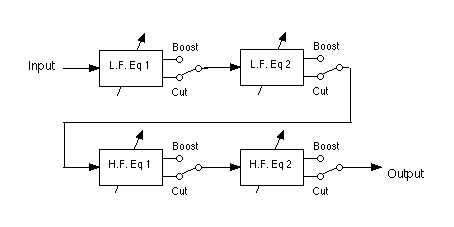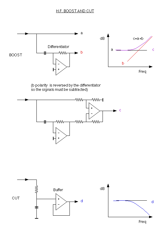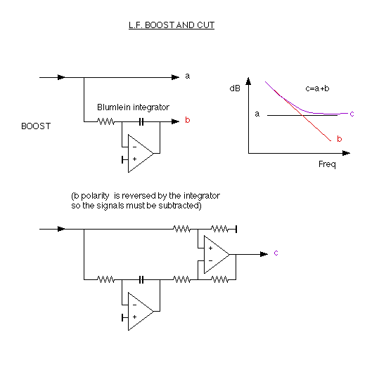 Using the circuit around Ic 1, Ic 2 and Ic 3 as an example: In the 'Boost' position of the switch, Ic 1 acts as a untiy-gain buffer, Ic 2 is arranged as the Blumlein integrator and Ic 3 combines the direct and integrated signals (with the integrated signal applied to the inverting input so as to regain its correct polarity after previously being inverted in the integrator). In the 'Cut' position of the switch, the unity-gain buffer, Ic 1 feeds the signal to the capacitive end of the time constant circuit, the resistive end being earthed. From the mid point, the diferentiated signal is taken to Ic 3, which acts as a unity-gain buffer because there are no signal or earth connections to its feedback network. Ic 2 is connected in a D.C. coupled positive feedback mode, which ensures that its output is locked to one of the power suppy rails and cannot generate any unwanted interference. In the 'Out' position, Ic 1 drives Ic 3 directly, so the signal passes through unaltered. Ic 2 is again disabled by positive feedback. |