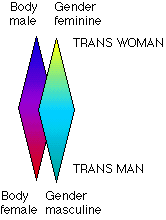 The term "transwoman" is used for a person with feminine gender but a male body at birth; the term "transman" is used for a person with masculine gender but a female body at birth.