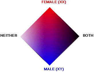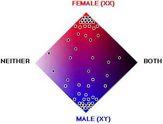 To represent the true nature of a person's apparent sex requires at least two axes: male-to-female and both-to-neither. [Apologies for appearing to reinforce the blue = boy and pink = girl stereotype, but this is less confusing than other possible colour choices]