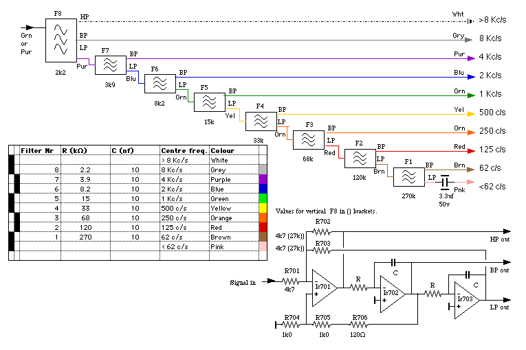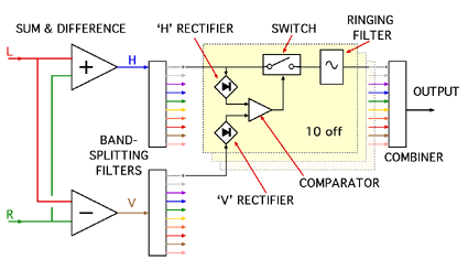The Vertical and Horizontal signals are each split into octave bands by filters. Each pair of bands is compared and, if the absolute amplitude (full-wave rectified voltage) of the Vertical signal is more than a certain percentage of the absolute value of the Horizontal signal, this indicates diagonal stylus movement corresponding to scratch or crackle.