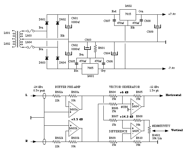 Because CMOS switches are used in later stages, it is important that the overall power supply is limited to 15v. Any signals that exceed the power supply voltage could cause latch-up of the CMOS circuit, so all the signal amplifiers must be fed from the same supplies. The gain of the vertical channel is higher than that of the horizontal channel to allow for some attenuation in the SENSITIVITY control.