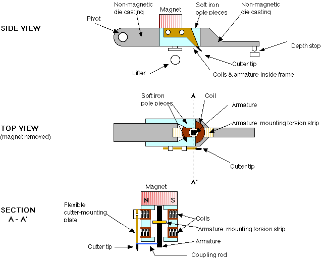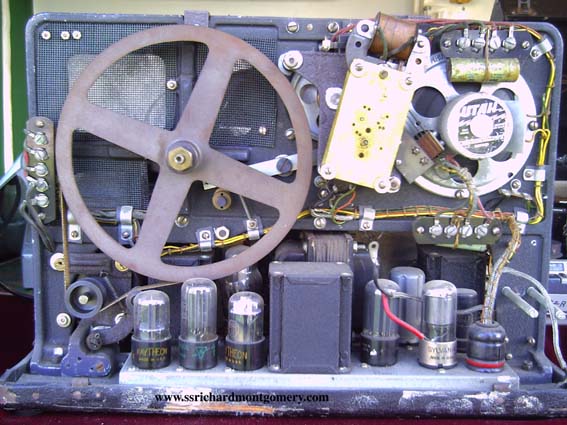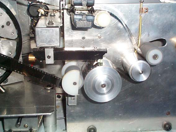 (Threaded with black film for clarity) The brake pressure roller has nylon guide cheeks with 39 mm spacing to allow bulky repairs and reinforcements to the film to pass through easily. The pickup arm is suspended from a die-cast box on a carriage which is tracked by a servo motor to follow the pickup position on the film. An optical mechanism inside the die-cast box controls the motor so that the pickup tracks correctly. The pickup is made from a composite structure with high internal damping, consisting of 5mm thick 3-ply wood with a cladding of 0.005" [0.127mm] aluminium alloy (lithography plate) bonded with bitumen mastic. The cartridge is a Shure M44C with a 0.002" conical stylus trailing at 30 degrees from the vertical. A counterbalance weight is set to give a tracking weight of around 5 gms. |