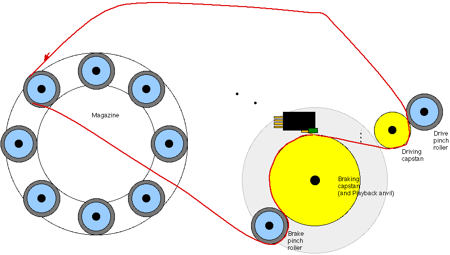 It uses uncoated 35mm Cellulose Acetate film, into which a laterally-modulated groove is embossed. The 'endless' film loops usually comprise 50 ft [15.24 m] of film, wound as a hank of 30 turns. This is loaded onto a magazine from which it is drawn from the centre, through the mechanism of the machine, by a sprocket wheel. During recording, the film is embossed with a sound-track in the form of a groove and then returned to the outside of the magazine. The standard recording speeds are 20, 40 and 60 feet per minute (4, 8 & 12 ips) [ 10.2, 20.4 & 30.6 cms/sec].
