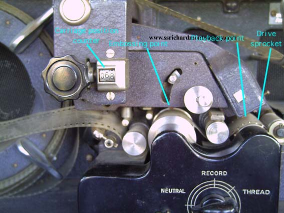 After one complete run through the loop, a series of scallops in the edge of the film operate an electrical contact which starts a tracking motor. This drives the carriage, which supports the recording and playback heads, across the width of the film for a distance of 0.01" [0.25mm]. The groove continues to be recorded, but is now displaced sideways from the starting alignment, so it does not cut into the existing recording.