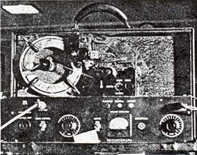 In these instruments 35 mm. film is used as the recording medium. The space between the perforations is used to record 100 sound tracks. The film is propelled at either 20 ft. or 40 ft. per minute. At the former speed, 61/2 ft. of film per hour are consumed, both sides of the film being utilized, At this speed the sound recording may be described as telephone quality, the upper frequency cut-off being in the neighborhood of 3,Q00 cycles pcr second. At 40 ft. per minute, the freqvency response is increased to 5,000 cycles per second. At this speed l21/2 ft. of film are consumed per hour. The cost of film suitably packaged and ready for use is 183/4c per hour for the slow speed and double that for the high speed recording. Details of one of these machines is shown in the photograph which is a semi-closeup of a portable model.